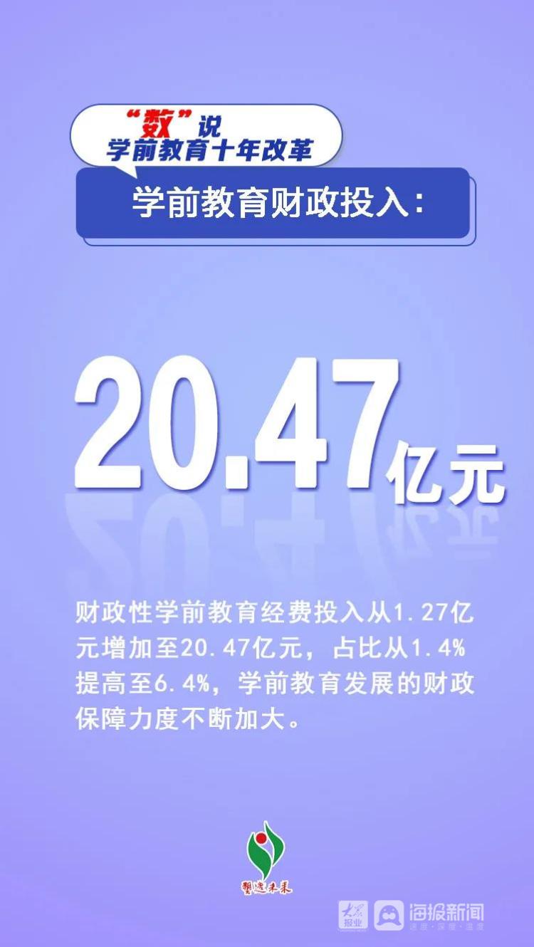 财政性学前教育经费投入从1.27亿元增加至20.47亿元,占比从1.4%提高至6.4%,学前教育发展的财政保障力度不断加大。