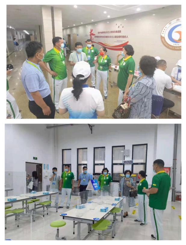 青岛市委统筹常态化疫情防控工作督查组史主任一行、青岛二中分校驻点督查专员——青岛市教育局孙校长、第十四届全国学运会筹备办领导、八大湖派出所警官来我校巡视检查,充分肯定我校为参赛人员准备的宿舍和餐厅环境优美、温馨舒适,对我校前期筹备工作给予高度认可。