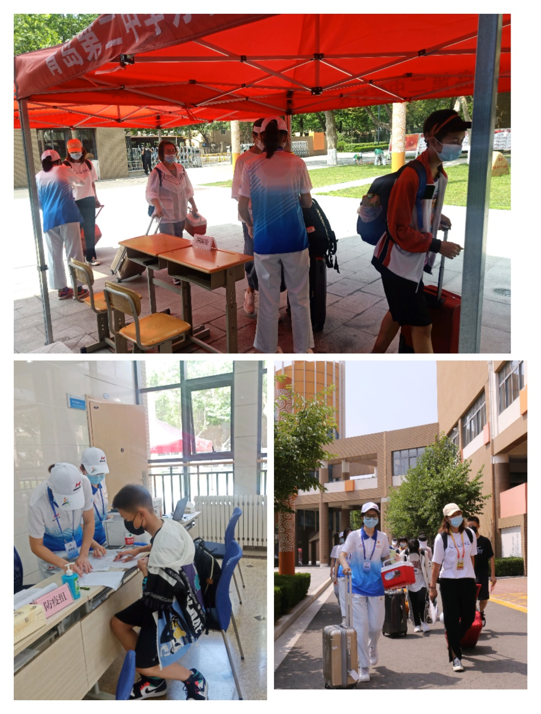 上午10点钟,河北中学队首先抵达青岛二中分校。参赛人员有序进行体温检测,绿码查验,在志愿者的引导下,快速完成防疫材料提交、领队缴费、网络办理、住宿办理等工作,随后进入宿舍进行隔离,整个过程组织有序、顺利高效。广东大学队、湖北代表队、吉林中学队等20支代表队共计200余名参赛人员陆续前来报到。