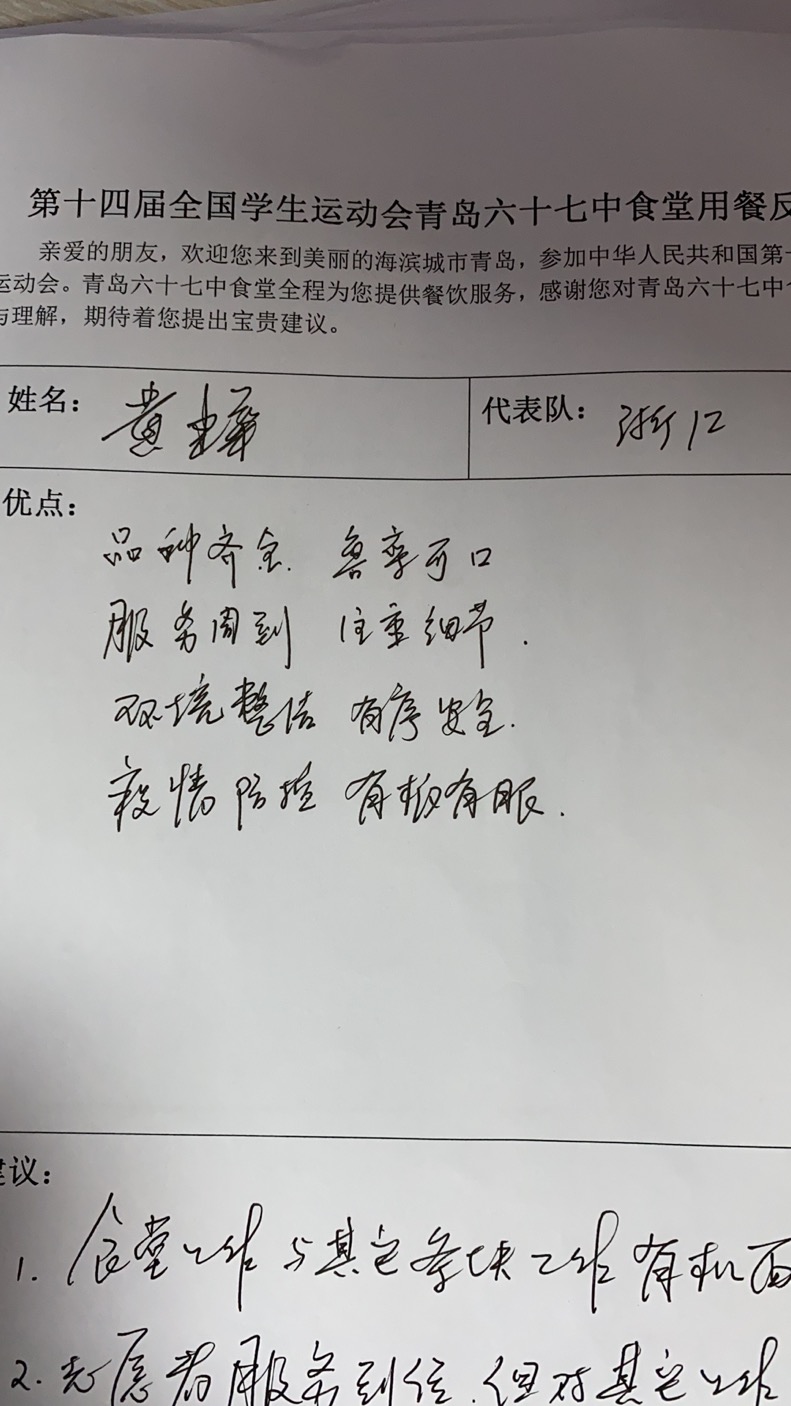 湖北队队员留言:“学校食堂提供的美食让我们印象深刻。最喜欢的一道菜是油泼鲍鱼,葱香味浓郁,十分可口。食堂师傅总是笑咪咪地关心我们‘咸淡如何?’‘能吃饱吗?’‘还想吃什么?’山东人的热情好客真是名不虚传啊。感谢青岛六十七中,让我们能更好地发挥自己的水平,在全国学生运动会上收获良多。青岛再见,欢迎青岛六十七中的老师同学们到湖北游玩!”