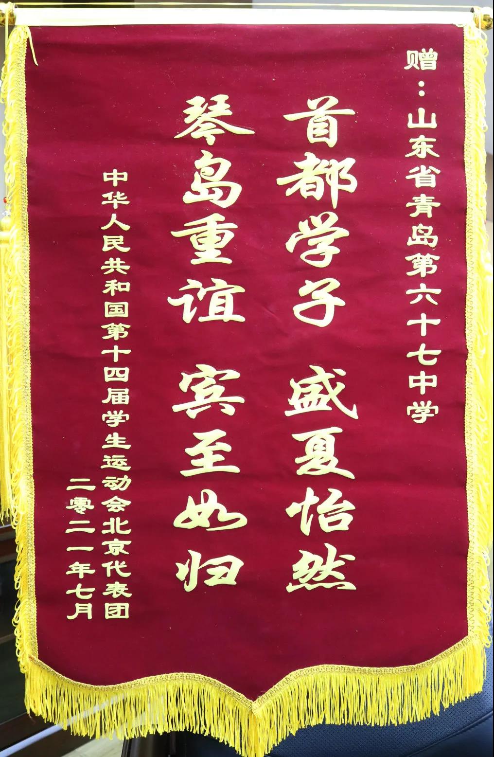 7月15日上午,第十四届全国学生运动会北京市游泳队代表团北京大学游泳队教练员余潜,专程来到青岛六十七中综合楼6楼会议室,将绣有“首都学子盛夏怡然琴岛重谊宾至如归”的锦旗送到学校领导手上,对青岛六十七中赛会期间提供的温暖贴心服务表示感谢。