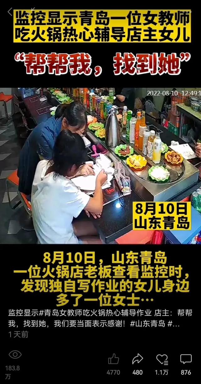 8月10日,青岛一位火锅店店主查看监控时发现,独自写作业的女儿身边多了一位女士。店主听女儿说,这是一位来吃饭的老师,看到自己做题遇到困难,就主动给讲了讲。这段视频在社交平台广泛传播,引发网友热烈讨论。