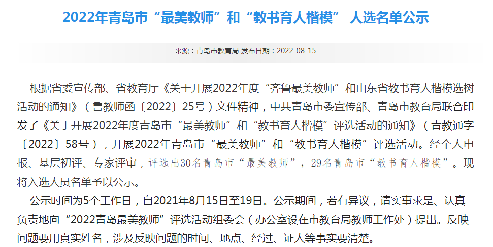 此前,中共青岛市委宣传部、青岛市教育局联合印发了《关于开展2022年度青岛市“最美教师”和“教书育人楷模”评选活动的通知》,开展2022年青岛市“最美教师”和“教书育人楷模”评选活动。经个人申报、基层初评、专家评审,评选出30名青岛市“最美教师”,29名青岛市“教书育人楷模”。现将入选人员名单予以公示。公示时间为2021年8月15日至19日。公示期间,若有异议,请实事求是、认真负责地向“2022青岛最美教师”评选活动组委会(办公室设在市教育局教师工作处)提出。反映问题要用真实姓名,涉及反映问题的时间、地点、经过、证人等事实要清楚。
