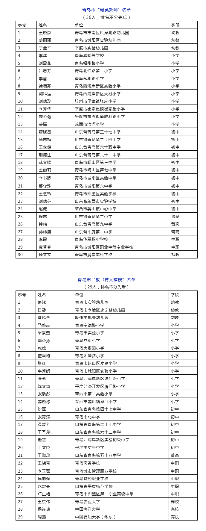 今天,市教育局公示了2022年青岛市“最美教师”和“教书育人楷模” 人选名单,其中青岛市“最美教师”30名,青岛市“教书育人楷模”29名。
